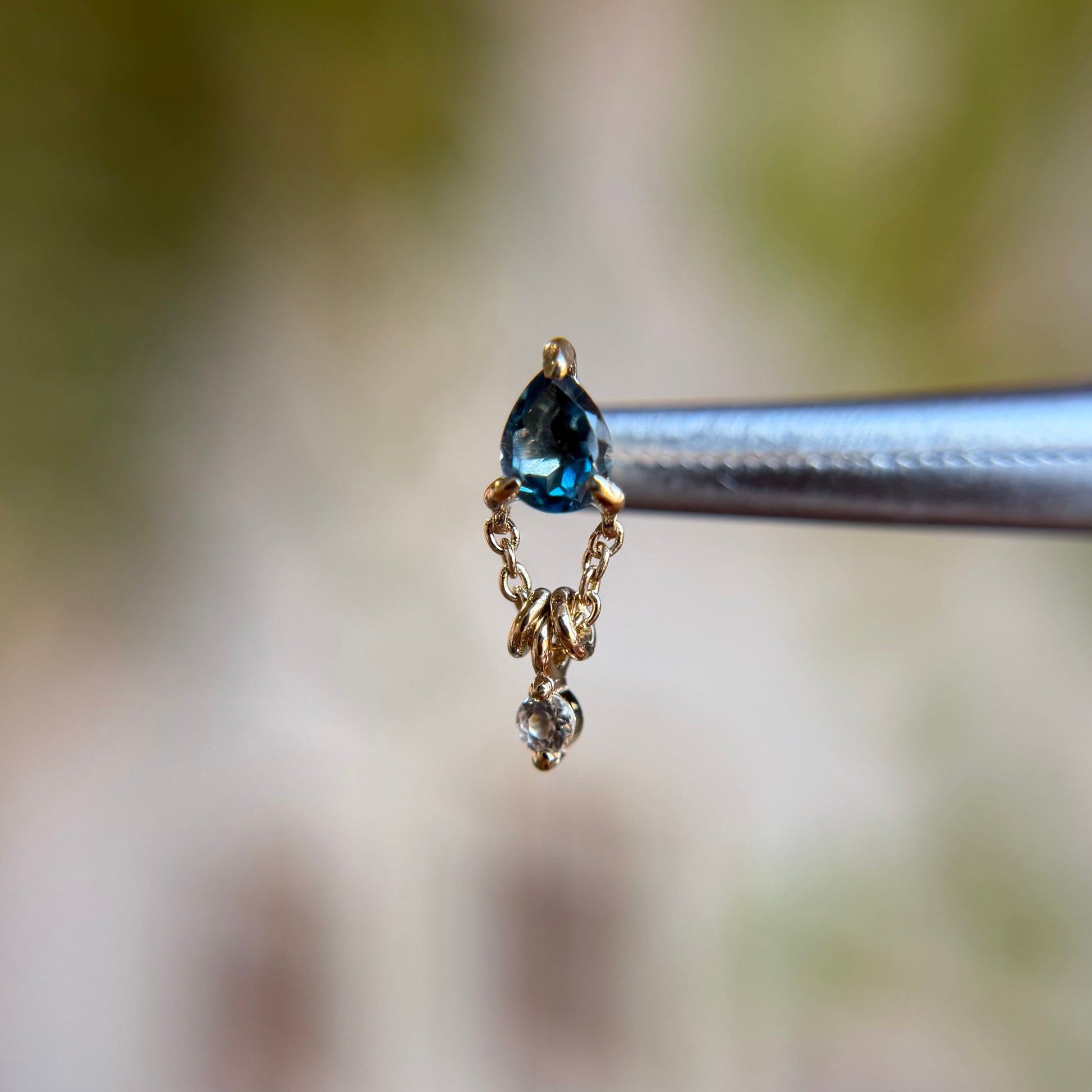 - Available in 14k Solid Yellow gold with (1) 3.5mm x 5mm Pear-cut London Blue Topaz and (1) 2mm White Sapphire gemstone