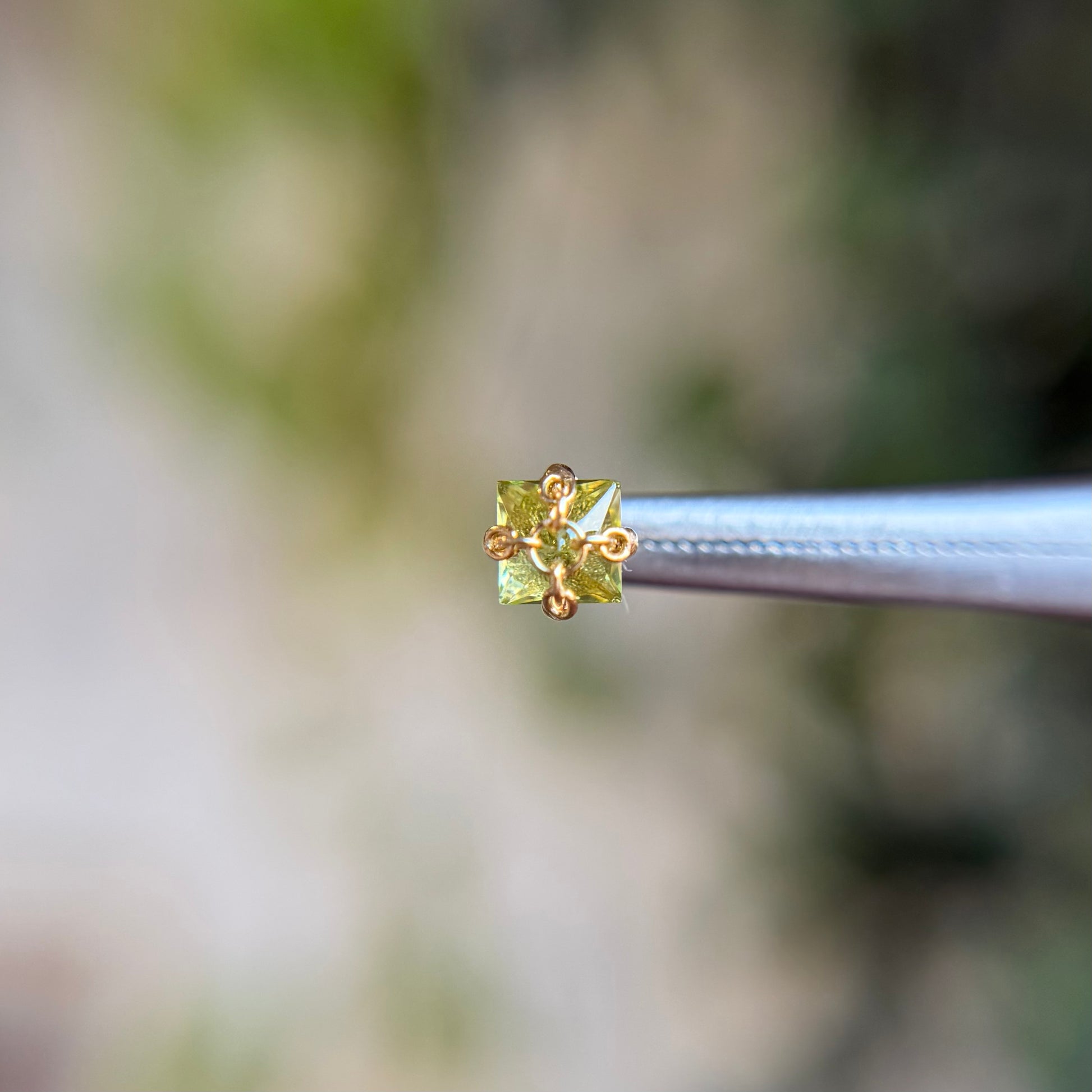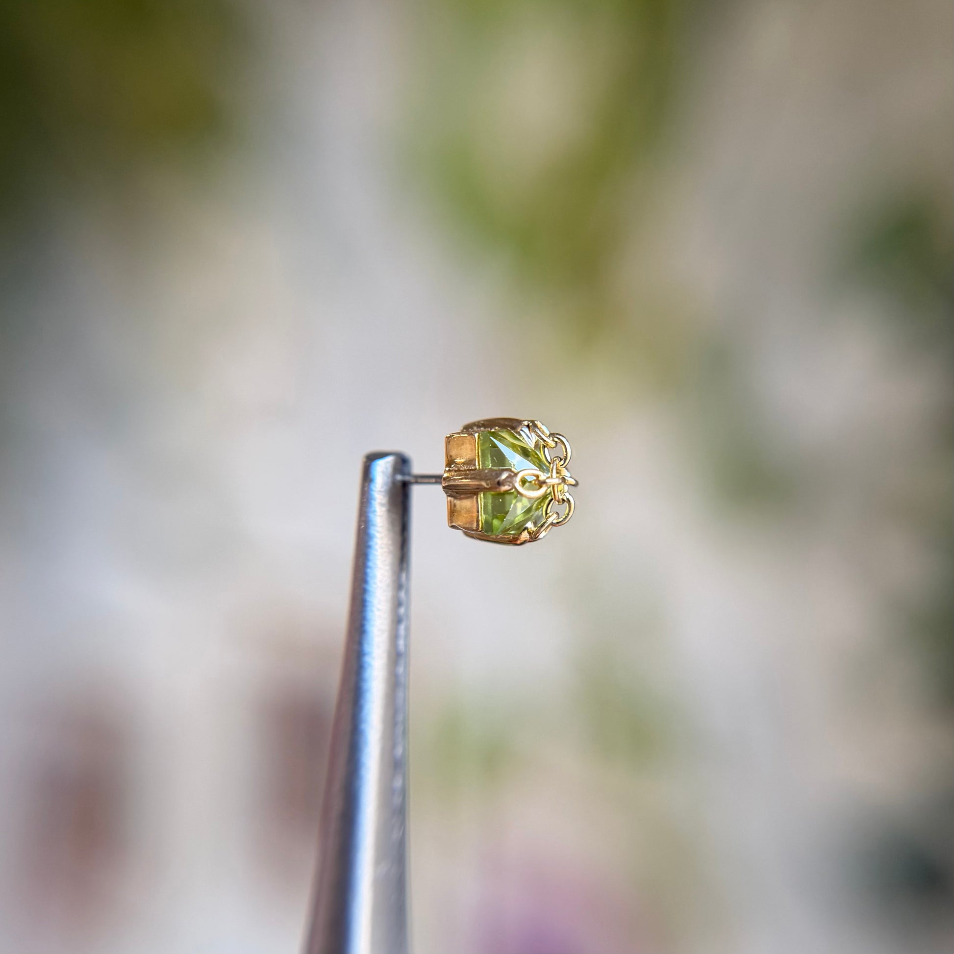 - Available in 14k Solid Yellow gold with a chain wrapping a princess cut Peridot gemstone