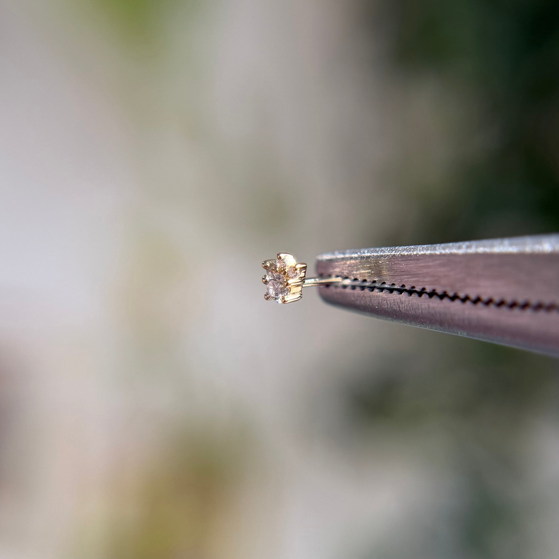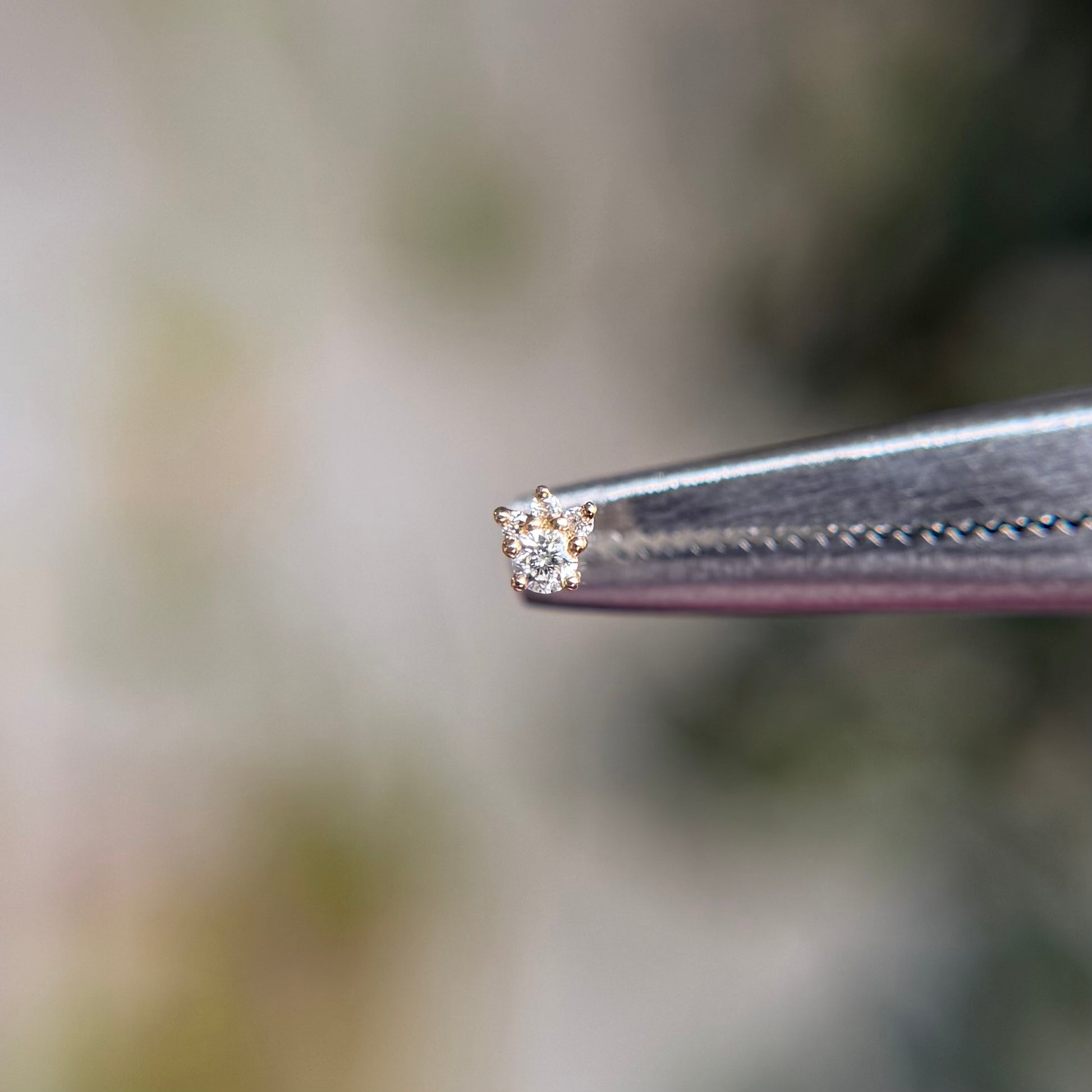 - Round faceted white diamond center with 3 smaller white diamonds across top