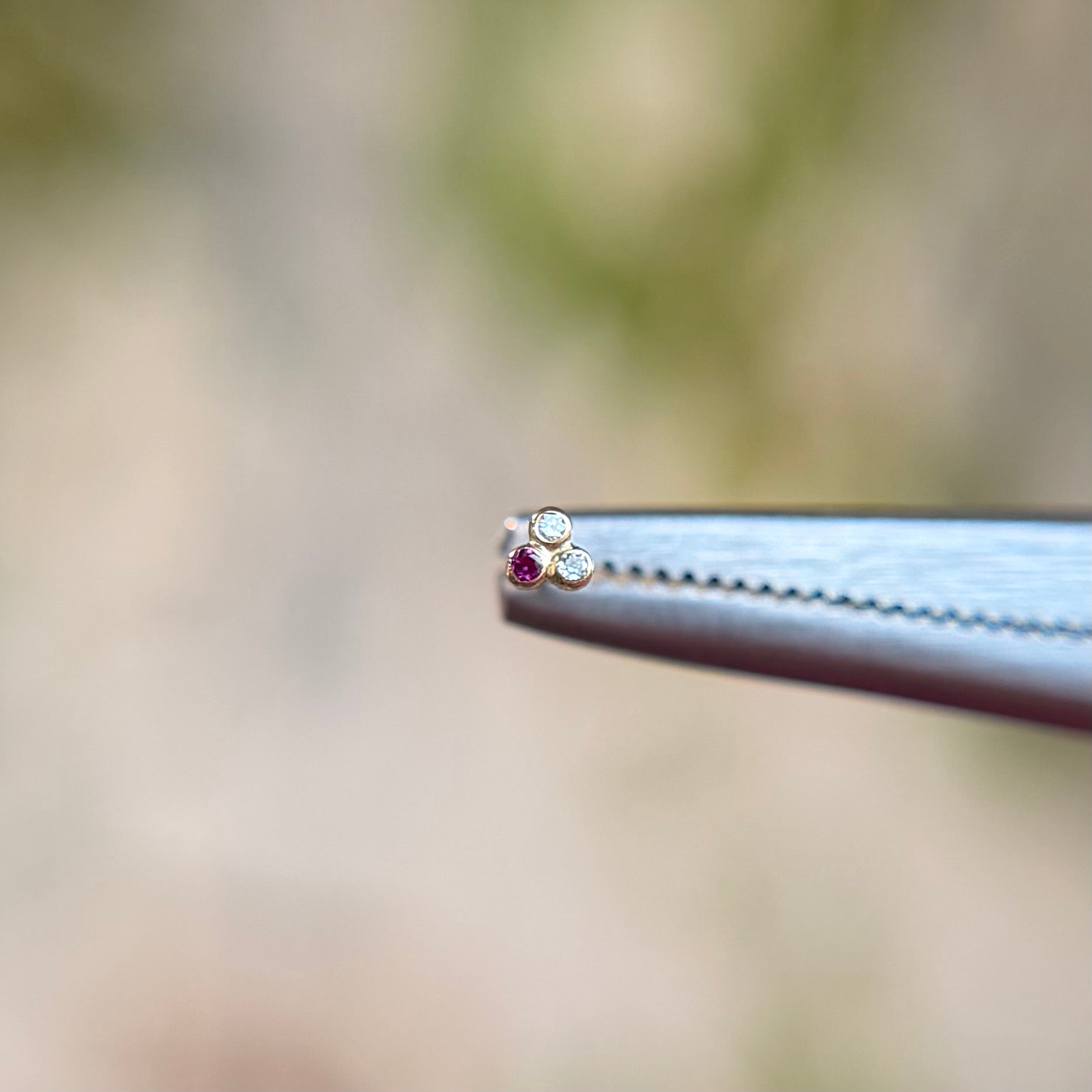 - Available in 14k Solid Yellow gold with (1) 1mm Ruby gemstone and (2) 1mm Diamond gemstones