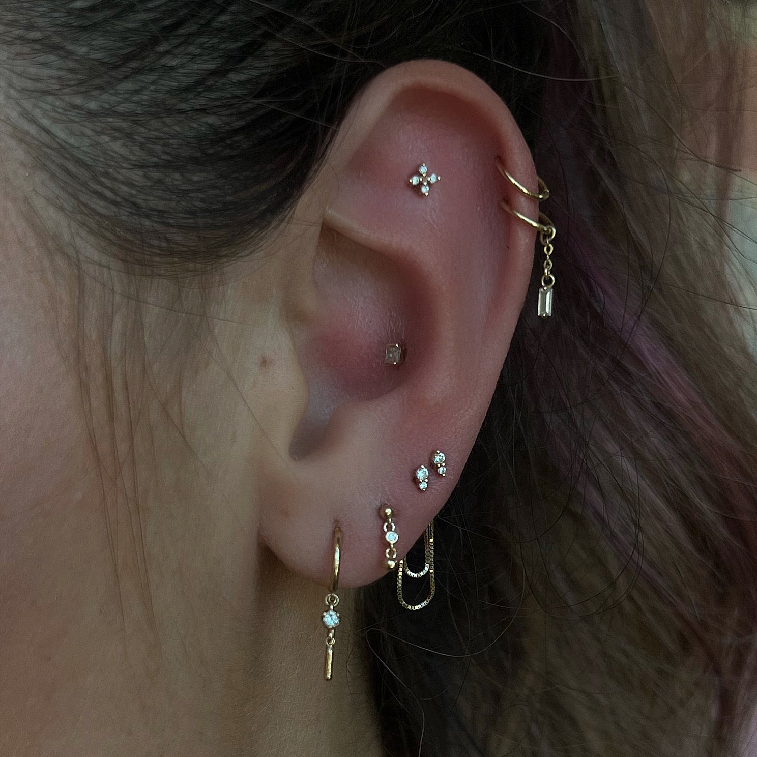 - Shown in third and fourth lobe piercings in 14k yellow gold