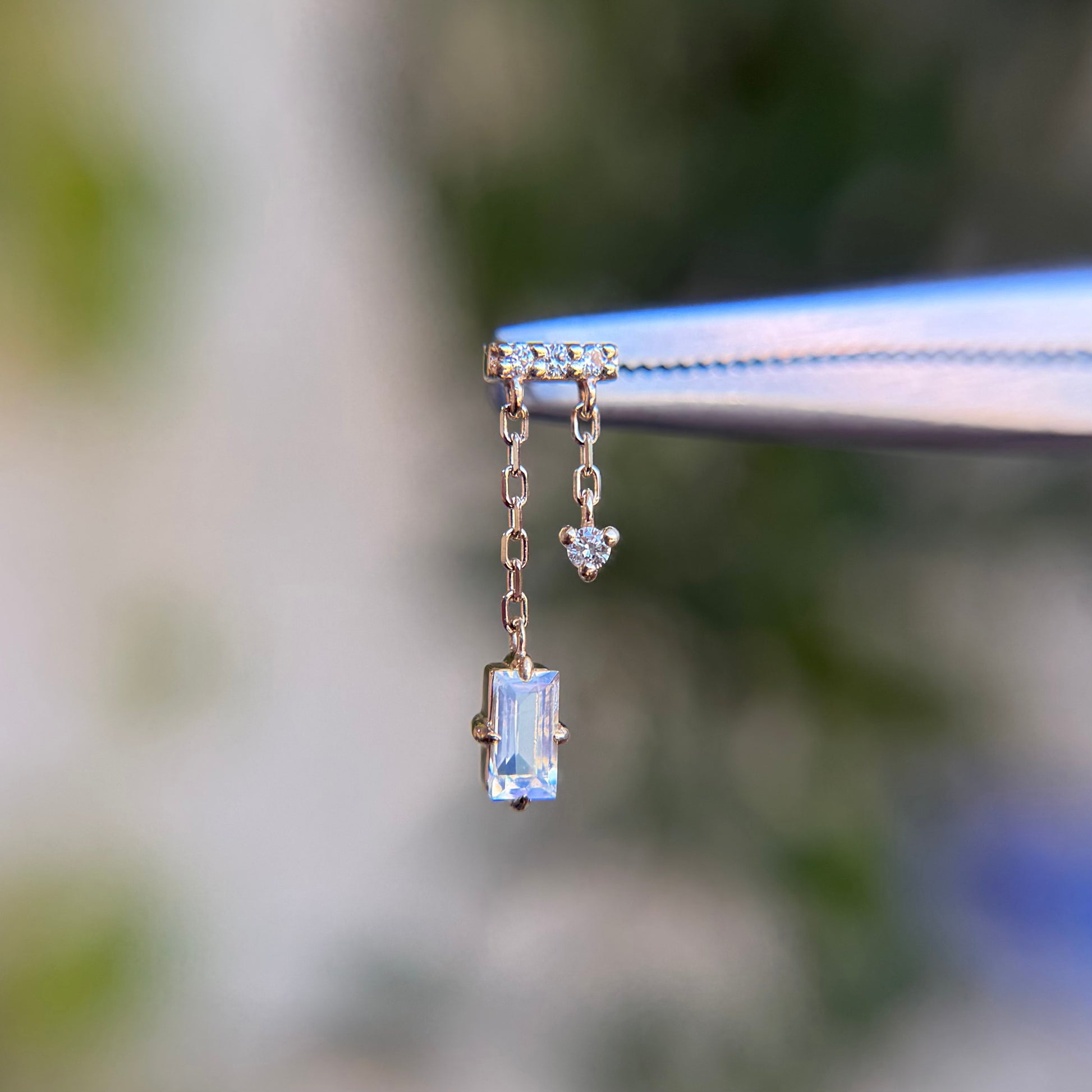 - Available in solid 14k yellow gold with 1 baguette moonstone and 1 diamond dangle