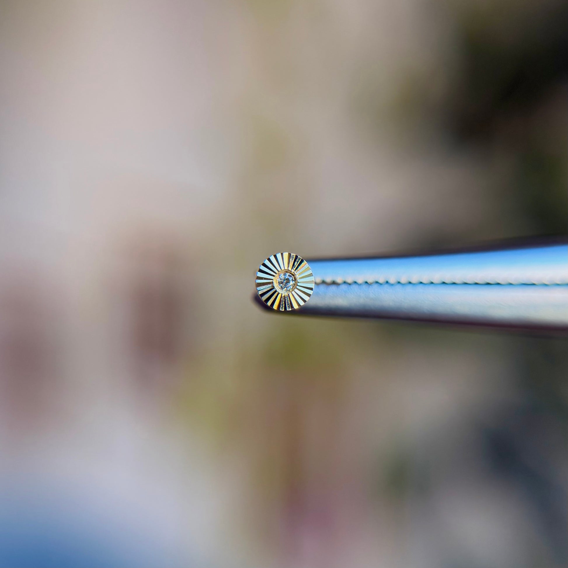 - 14k gold disc with one flush set diamond in the center and ray pattern
