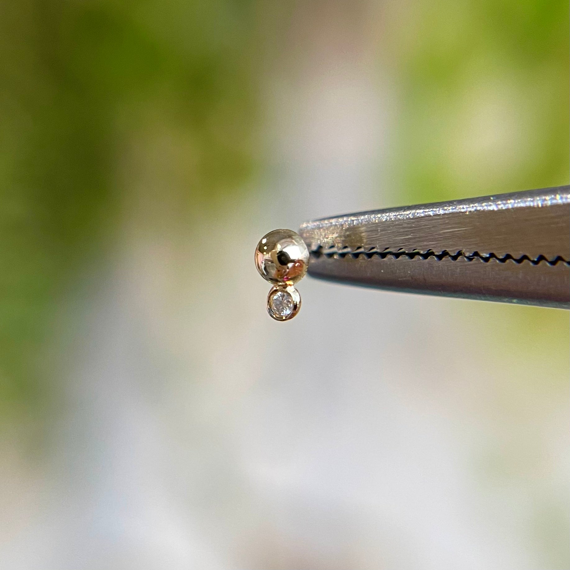 - Available in 14k Solid Yellow gold with (1) 1.5mm bezel-set genuine diamond dripping from a solid gold ball
